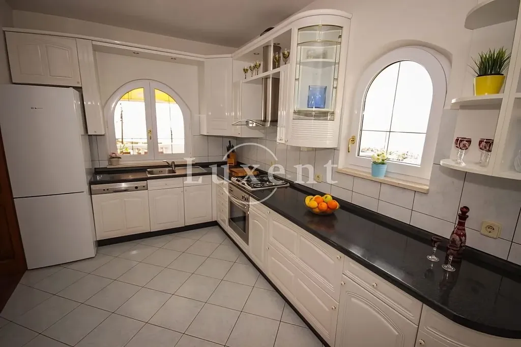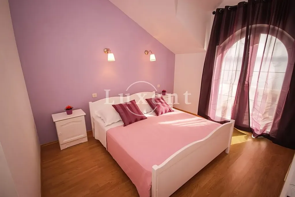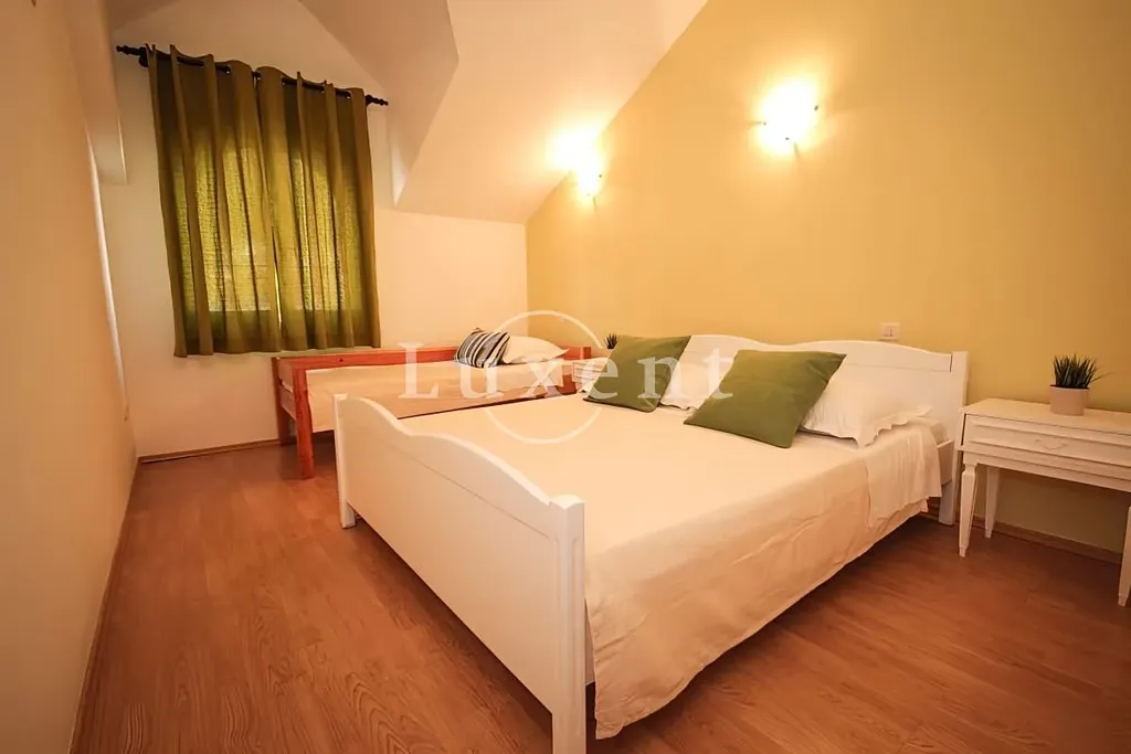 V přízemí domu se nacházejí tři samostatné jednopokojové apartmány. Tyto jednotky jsou vhodné jak pro krátkodobý turistický, tak i pro dlouhodobý pronájem. V prvním patře je situován prostorný apartmán, který disponuje velkou lodžií a nabízí krásný výhled na moře. Ve druhém patře se nachází další třípokojový apartmán s přístupem na lodžii a otevřenou terasu, která poskytuje příjemný venkovní prostor k relaxaci. V podkroví je umístěn prostorný třípokojový byt s balkonem, ideální například pro rodinu.