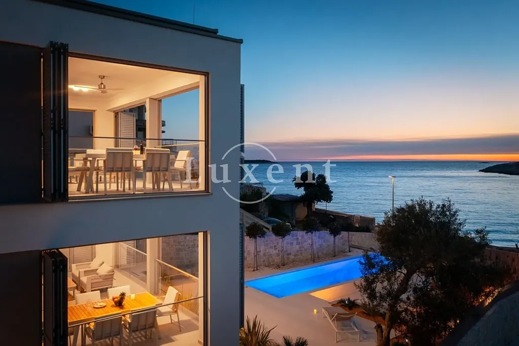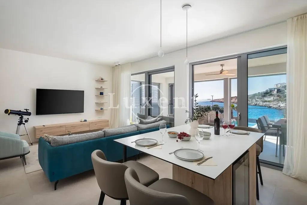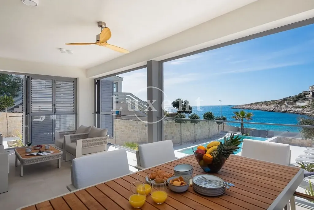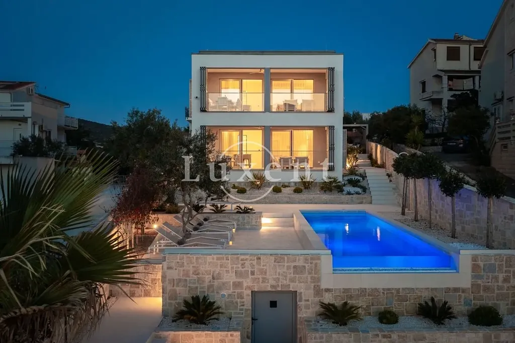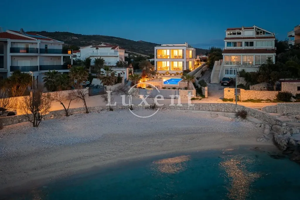 Nabízíme k prodeji nádhernou novostavbu vily s bazénem, situovanou v malém turistickém letovisku poblíž Rogoznice v první řadě u moře. Vila leží jen pár kroků od malebné přírodní oblázkové pláže a působivých kamenných útesů. Díky své jihozápadní orientaci si užijete celodenní slunce a dechberoucí západy.