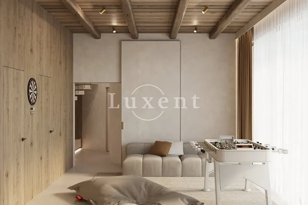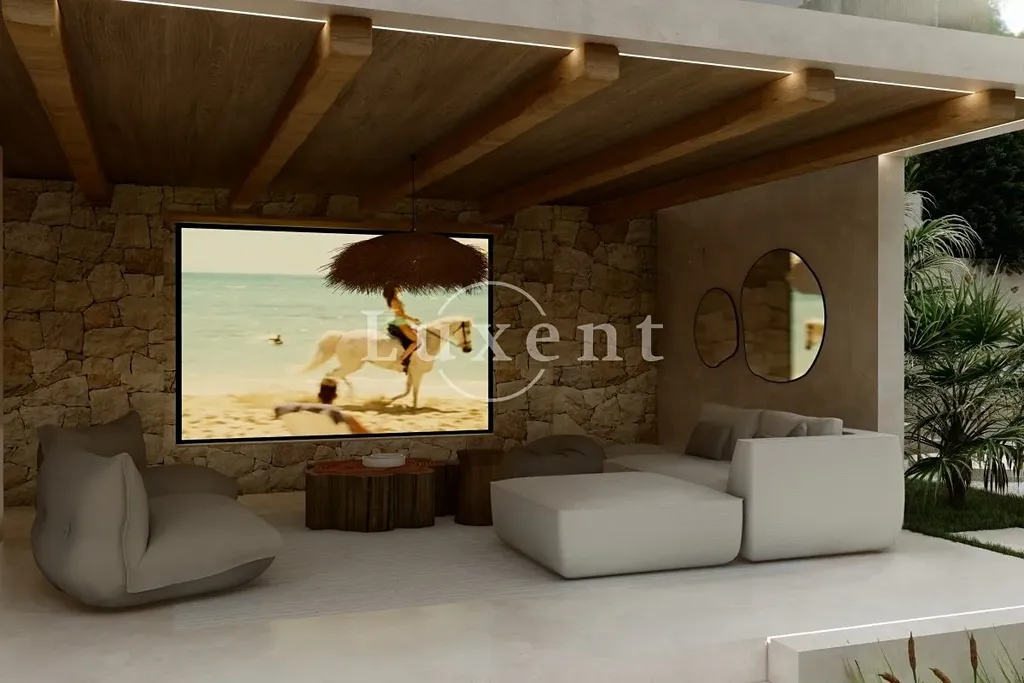 Vila je rozdělena do dvou podlaží a nabízí pět prostorných ložnic a šest moderních koupelen. Přízemí tvoří otevřený obytný prostor s kuchyní, jídelnou a obývacím pokojem s přímým výstupem na rozlehlou terasu. Součástí přízemí jsou také technické místnosti, prádelna, toaleta, posilovna, sauna a vnitřní bazén s protiproudem. V suterénu se nachází prostor pro odpočinek a zábavu s venkovní kuchyní, grilem, krytou letní jídelnou a venkovním kinem.