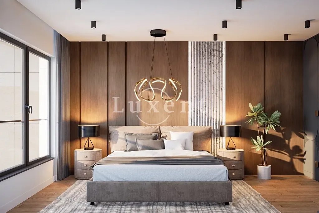 Apartmán o celkové ploše 138,79 m² je propojen vnitřním schodištěm i výtahem a rozkládá se v přízemí a v prvním patře budovy. Přízemí tvoří otevřený obytný prostor s kuchyní, jídelnou a obývacím pokojem, který přirozeně navazuje na venkovní část s terasou a zahradou. Dále se zde nachází toaleta a vstup na schodiště. V patře je chodba, prádelna, tři ložnice a dvě koupelny.