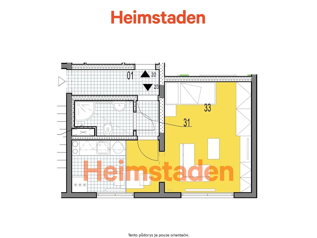 Byt se skládá z hlavního obytného pokoje s plovoucí podlahou a menším kuchyňským koutem, který je vybaven kuchyňskou linkou. Koupelna je společná s toaletou a je vybavena sprchovým koutem. Díky velkým oknům je byt po celý den příjemně prosvětlený.