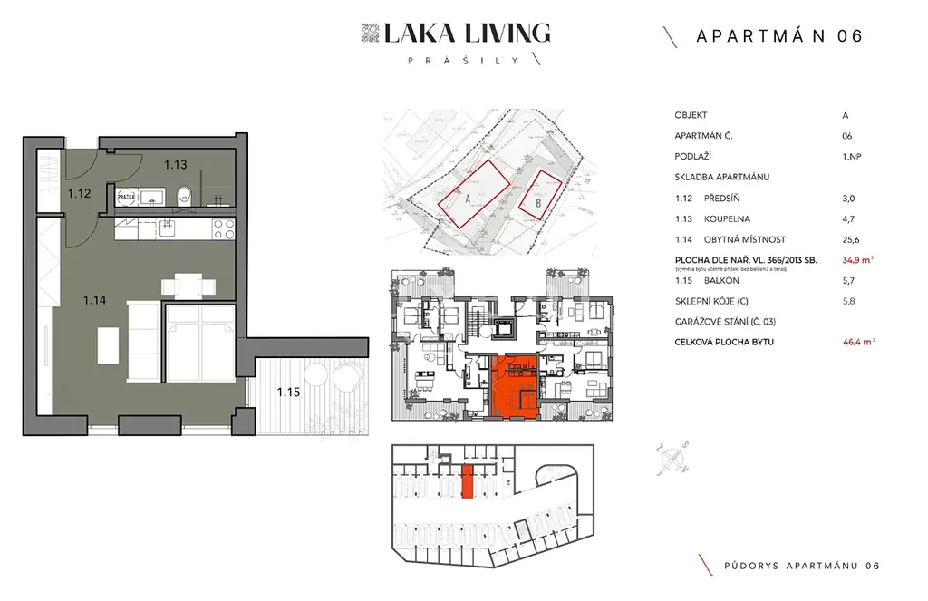 Nabízíme k prodeji luxusní horský apartmán o dispozici 1+kk o obytné ploše 33,3 m² a podlahové ploše 34,9 m² s balkonem o velikosti 5,7 m². Byt se nachází v 1. nadzemním podlaží apartmánového domu „A“ v nově vznikajícím developerském projektu LAKA LIVING na Šumavě. Apartmán je orientován na JV stranu. Byt se skládá z obytné místnosti (25,6 m²), koupelny se sprchou a toaletou (4,7 m²) a předsíně (3 m²).