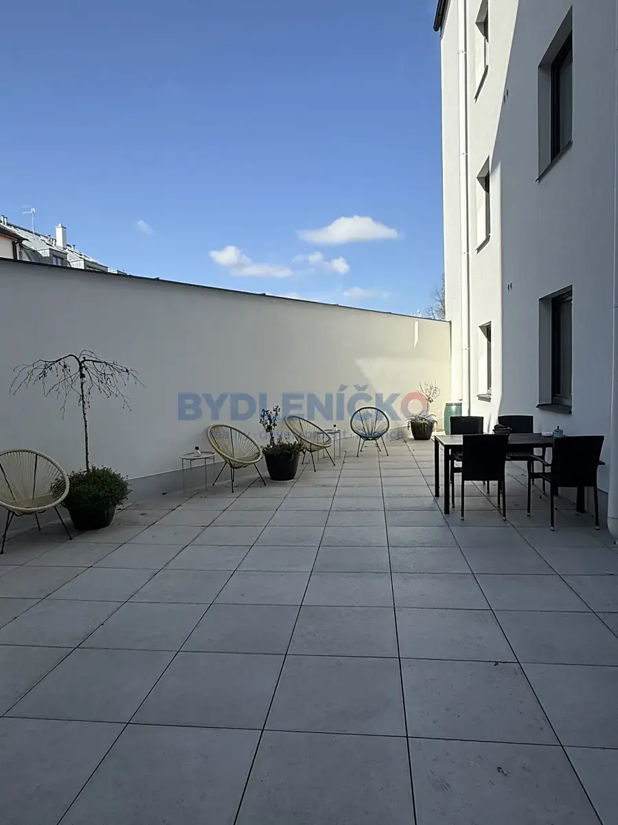 Tento atypický byt je tvořen dvěmi velmi prosvětlenými pokoji: ložnice s orientací na východ a obývací pokoj s elektrickým krbem, kuchyňským koutem a barovým sezením. Dále je zde prostorná předsíň a koupelna s vířivou vanou a toaletou. Byt se pronajímá v kompletně vybaveném stavu tak, jak je patrné z fotografií.