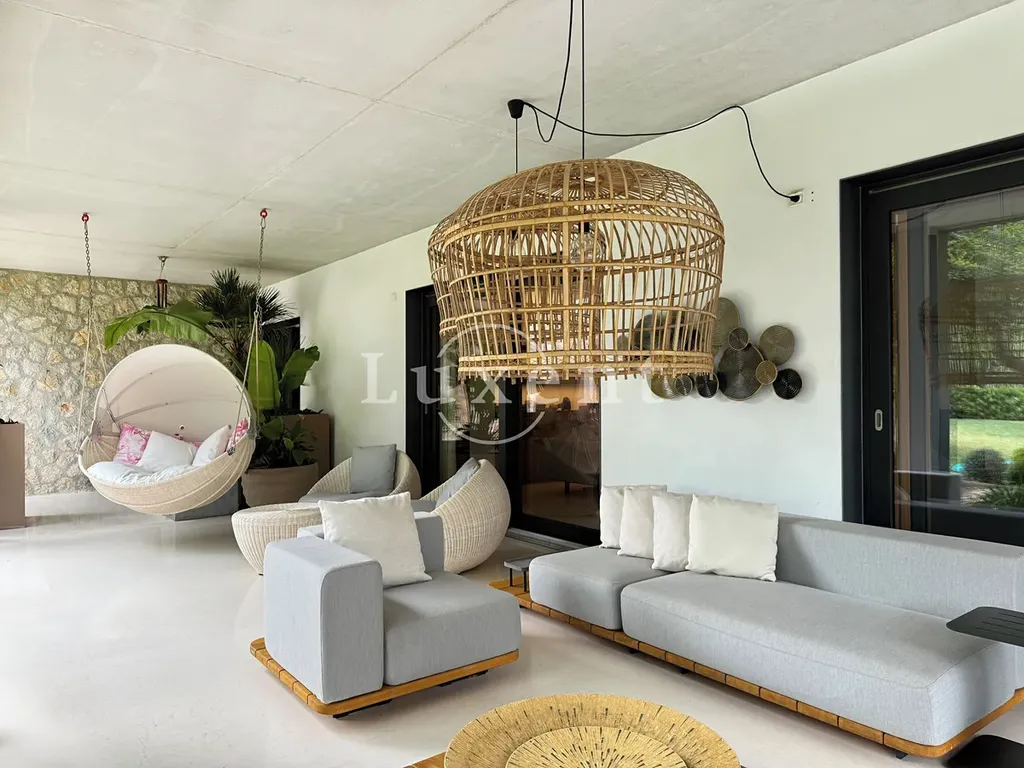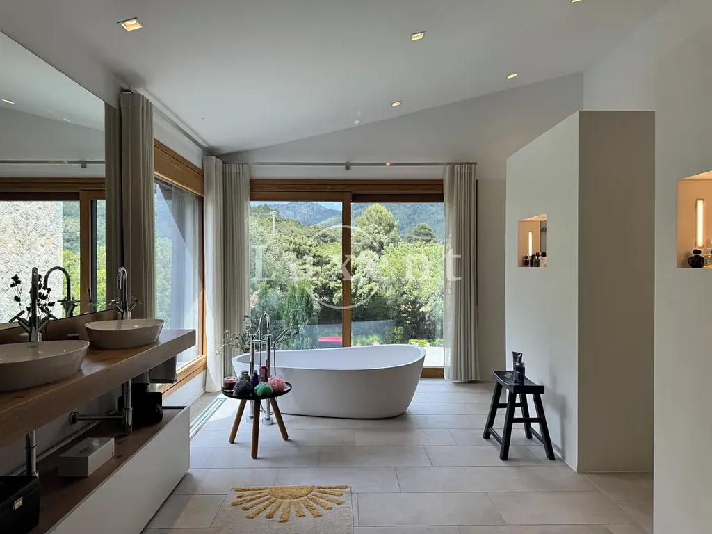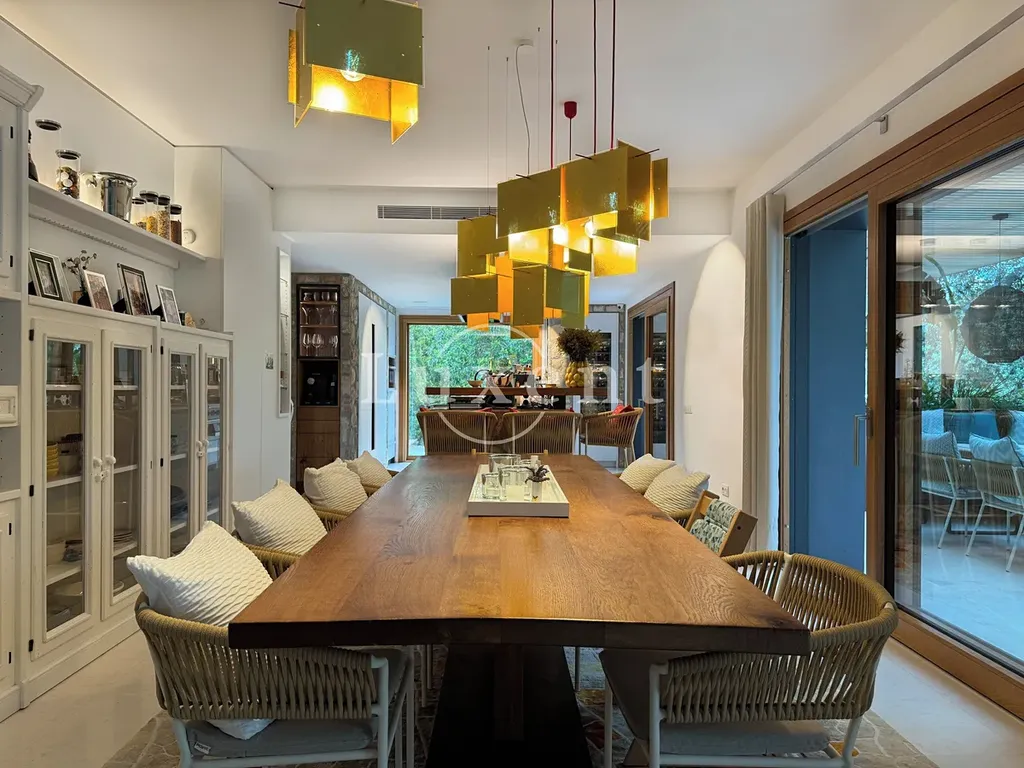 s jídelnou a kuchyní s mini vinotékou. Horní patro zahrnuje hlavní ložnici s vlastní koupelnou a šatnou, další tři ložnice, každá s vlastní koupelnou a vstupem na terasu s překrásnými výhledy na podhoří.