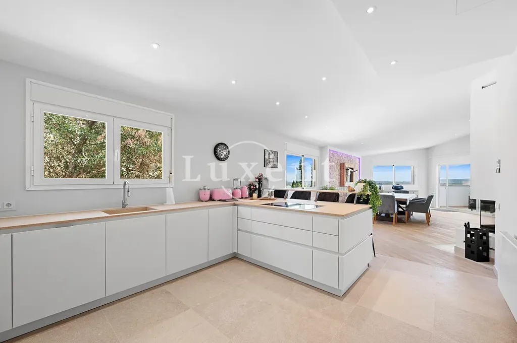 Prostorný a otevřený obývací pokoj s jídelnou je ideální pro společenské akce, a moderní kuchyně je vybavena špičkovými spotřebiči včetně vinotéky, trouby Miele, varné desky Bora s ostrůvkovým řešením, dvou velkých kombinovaných lednic s mrazničkou, myčky na nádobí, kávovaru Miele a šuplíky na ohřev nádobí. Částečně krytá terasa nabízí skvělé místo k odpočinku s nádherným výhledem.