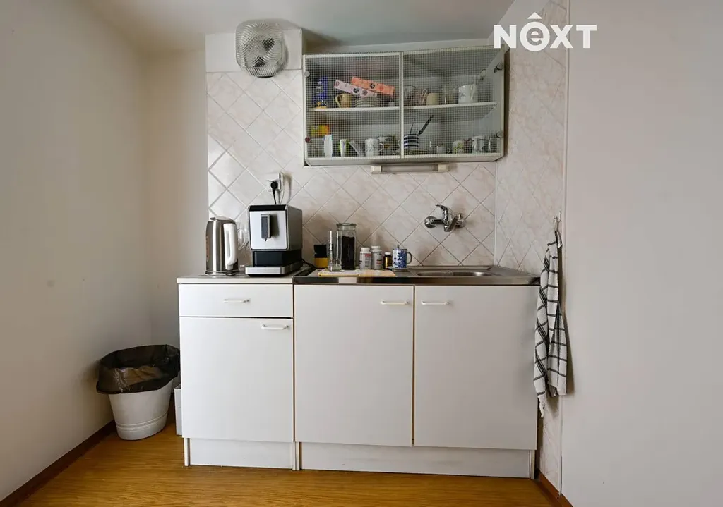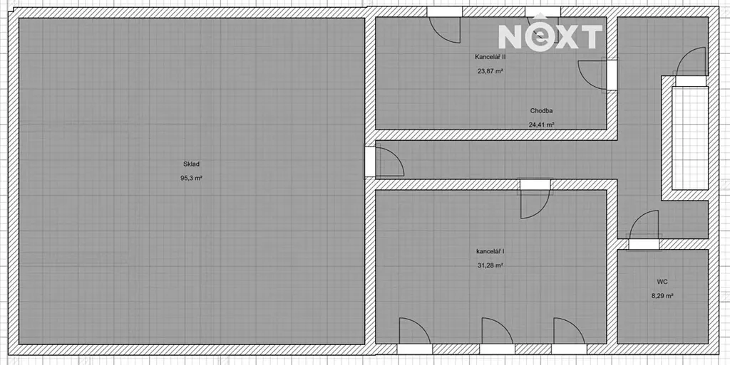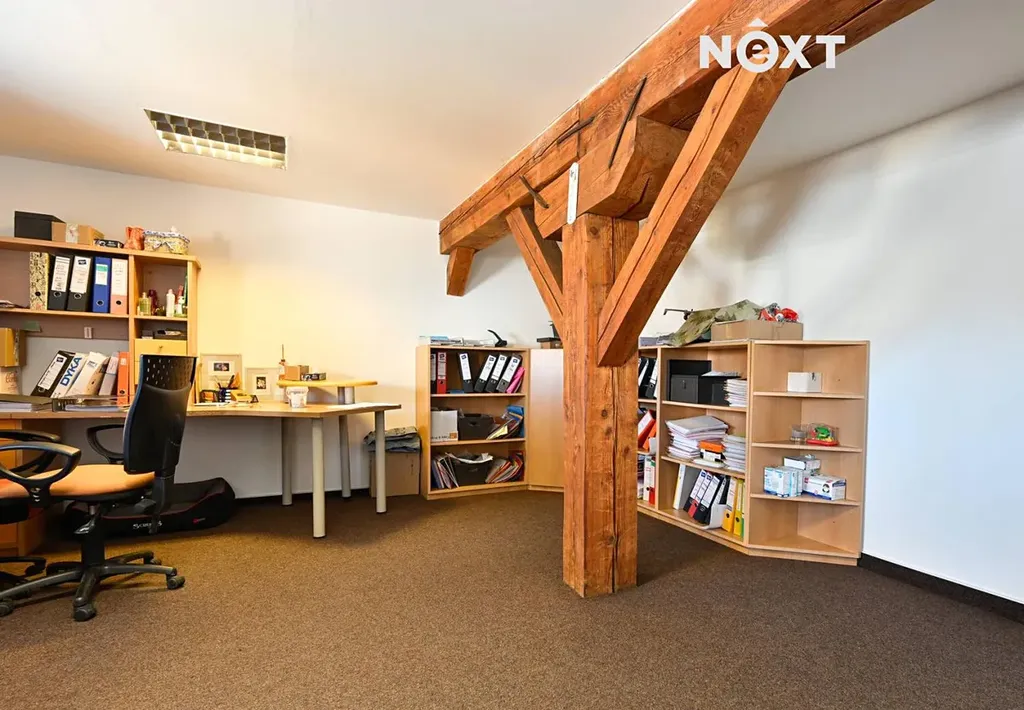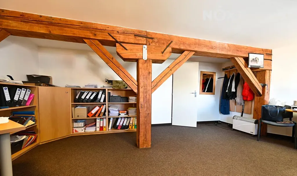 Patro (administrativa a sklady): V patře se nachází moderní kancelářské prostory (cca 55 m²) rozdělené na dvě samostatné kanceláře (31,28 m² a 23,87 m²) propojené chodbou, sociální zařízení (WC) a rozlehlý sklad o výměře 95,3 m².