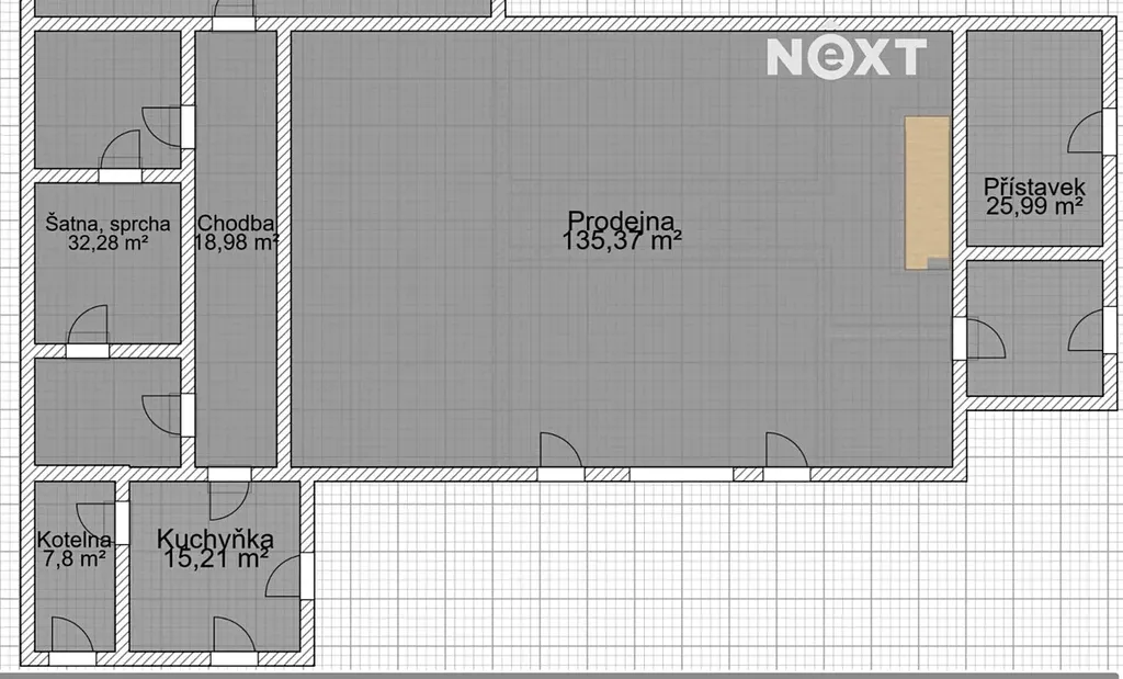 Přízemí (235 m²): Dominantou je obchodní prostor (prodejna) o výměře 135,37 m². Dále zde najdete kompletní zázemí: kuchyňku (15,21 m²), šatny se sprchami (32,28 m²), kotelnu a přístavky o celkové ploše 26 m².