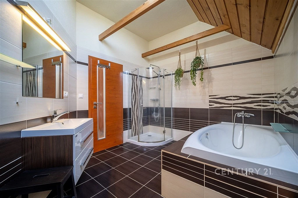 V přízemí se dále nachází velká univerzální místnost, wellness se saunou a sprchovým koutem a také samostatné WC.