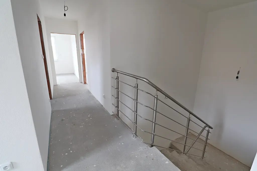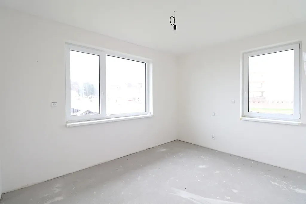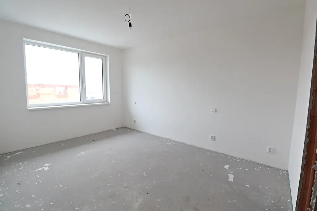 Světlý obývací pokoj propojený s budoucím kuchyňským koutem – ideální místo pro rodinné chvíle.