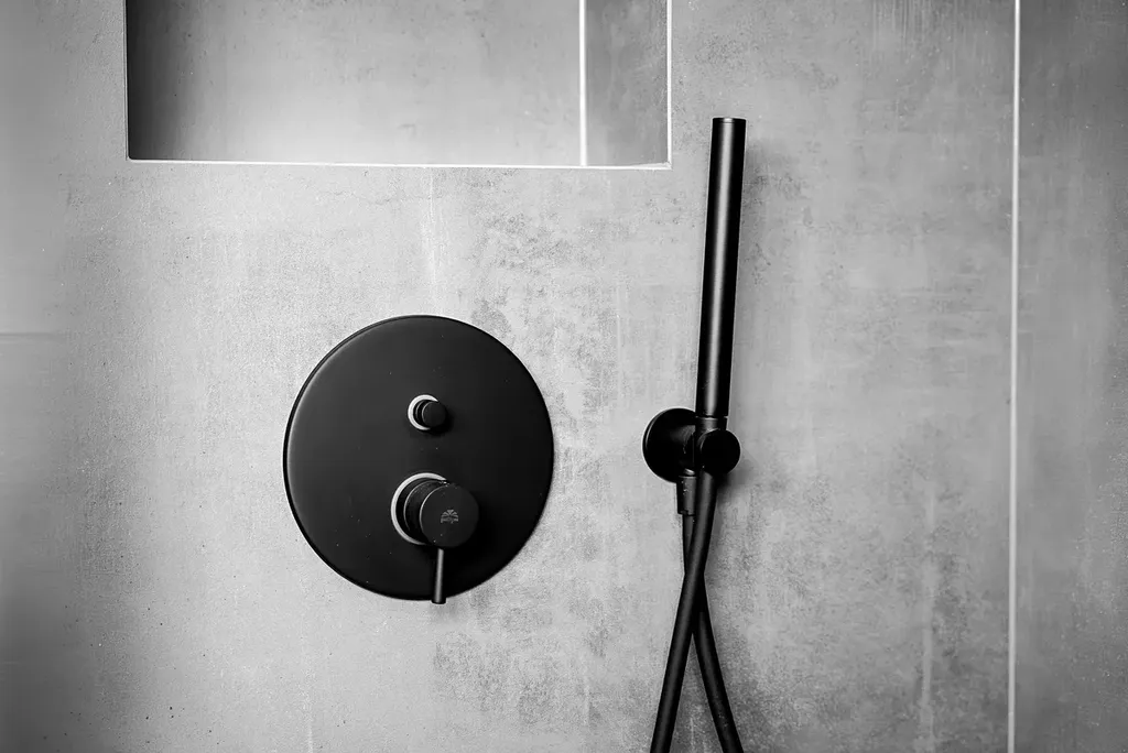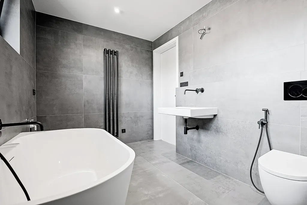 Koupelny s italskou velkoformátovou dlažbou a podomítkovými bateriemi působí elegantně, přitom funkčně.