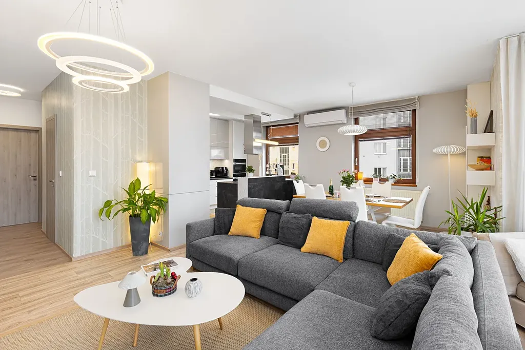 Otevřený obytný prostor 47 m² s velkoformátovým prosklení, přičemž obývací část plynule navazuje na zakázkovou kuchyňskou linku s ostrůvkem a spotřebiči Miele, jídelnu i relaxační zónu. Hlavní ložnice (20 m²) má vlastní koupelnu a vstup na balkon. Další pokoje lze flexibilně využít jako pracovnu, dětské pokoje či pokoj pro hosty.
