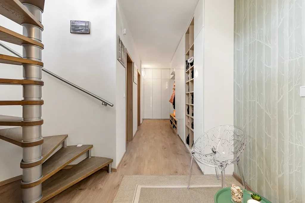 Spodní patro tvoří přirozené centrum domova se třemi ložnicemi, dvěmi koupelnami a prostornou walk-in šatna, která jen podtrhuje důmyslné uspořádání jednotky.