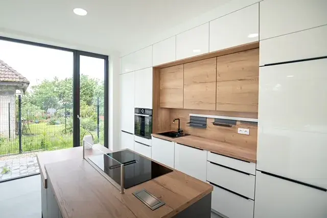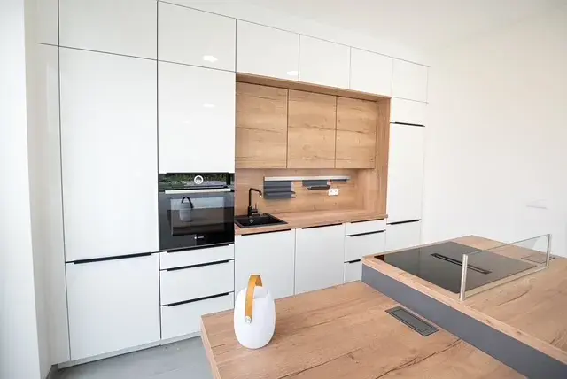 V bytě je moderní kuchyňská linka se všemi spotřebiči.