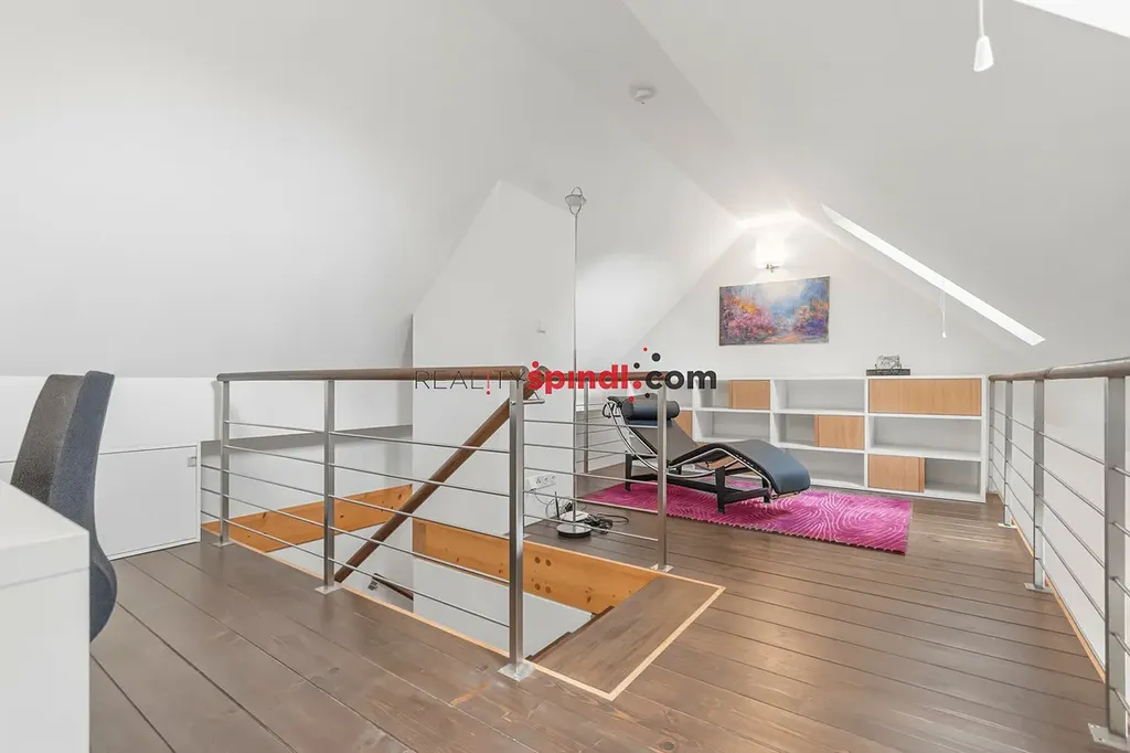 Součástí obytného prostoru je otevřená galerie, která nabízí klidné místo pro práci i odpočinek a dodává interiéru další rozměr i lehkost.