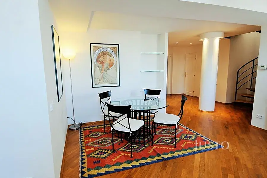 Dvoupodlažní půdní byt má dvě koupelny. Vysoce kvalitní zařízení, orientální koberce, TV, satelit a DVD.