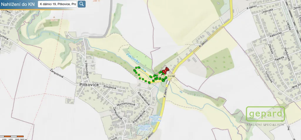Jedná se o pozemky parc. č. 278/1, 278/2, 280/7, 280/8, 280/9, 280/10, 281/4, 282/5, 283/2, 284/2, 190, 191, 192 (součástí pozemku je stavba č. p. 19, rod. dům), 193, 194 a 196, vše v katastrálním území Pitkovice. Dle platného územního plánu spadají tyto pozemky do kategorie ZMK – zeleň městská a krajinná. Podél Pitkovického potoka je vymezen biokoridor ÚSES. Tyto skutečnosti podtrhují výjimečnost a přírodní charakter lokality, zároveň je však nutné je zohlednit při plánování budoucího využití.