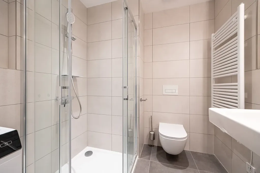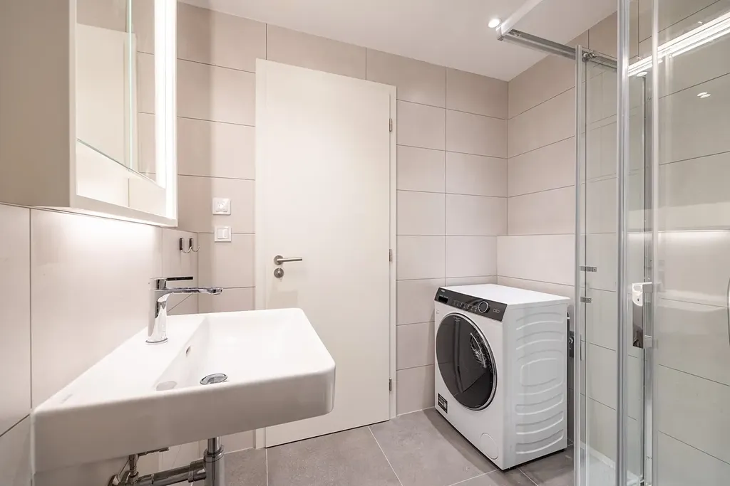 - koupelna se sprchovým koutem, toaletou a kombinovanou pračkou se sušičkou značky Haier.