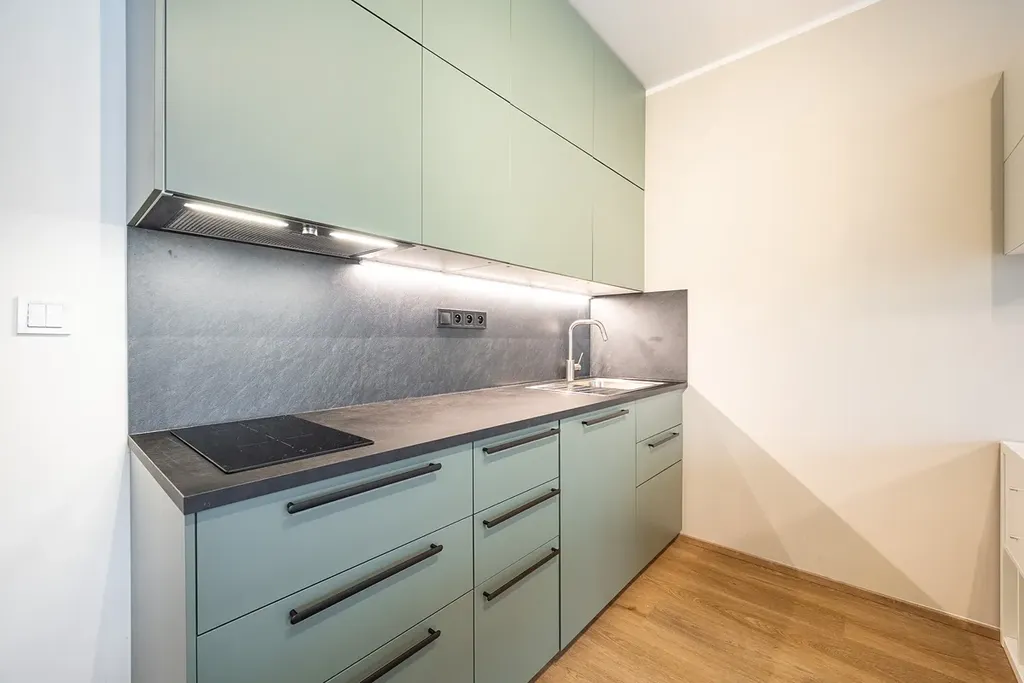 Kuchyňská linka IKEA na míru v nadčasové zelenošedé barvě, vestavné spotřebiče (myčka, trouba, mikrovlnná trouba, lednice s mrazákem), jídelní stůl se židlemi, rozkládací postel s úložným prostorem, TV Samsung, TV skříňky a úložné sestavy na míru. Stačí se nastěhovat.
