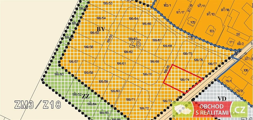 V této inzerci nabízíme pozemek parc. č. 199/74 o výměře 1.263 m². Pozemek se nachází v jednosměrné ulici s omezeným provozem aut (jen sousedi). Pokud se pojedete na místo podívat, pozemek je na místě označen číslem 4.
