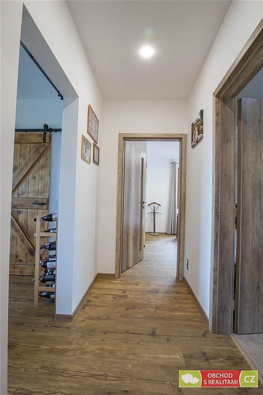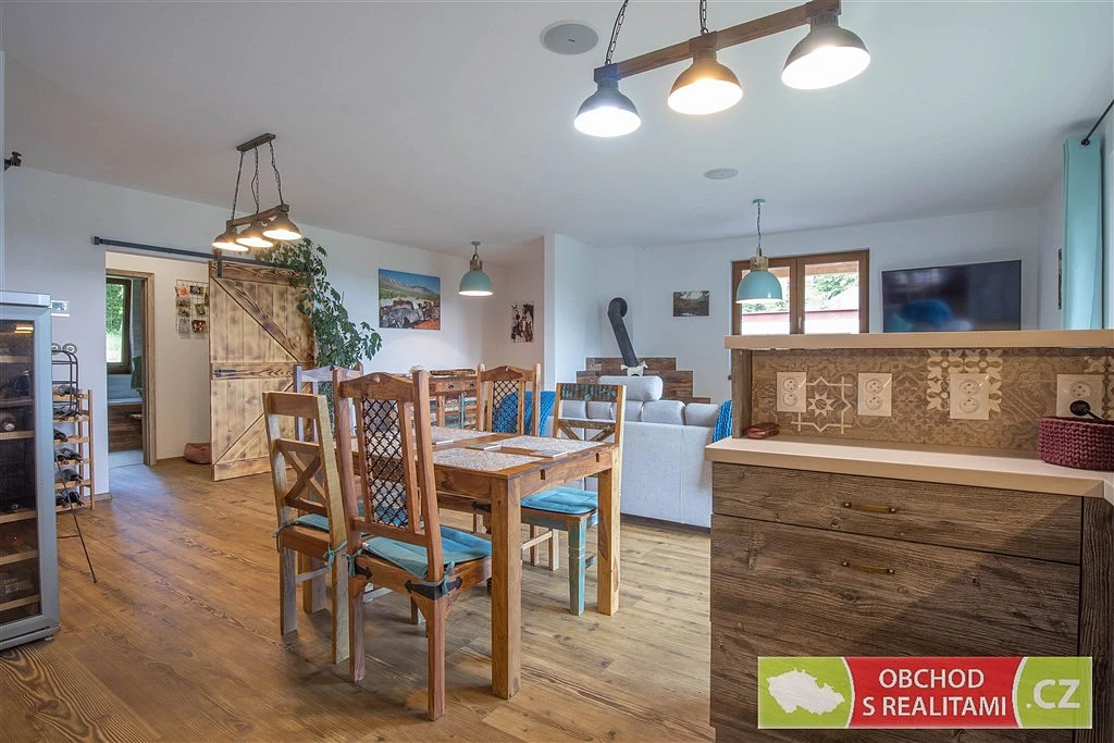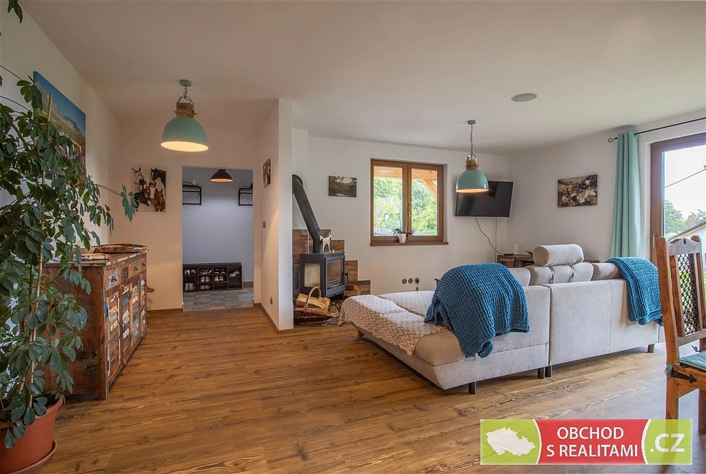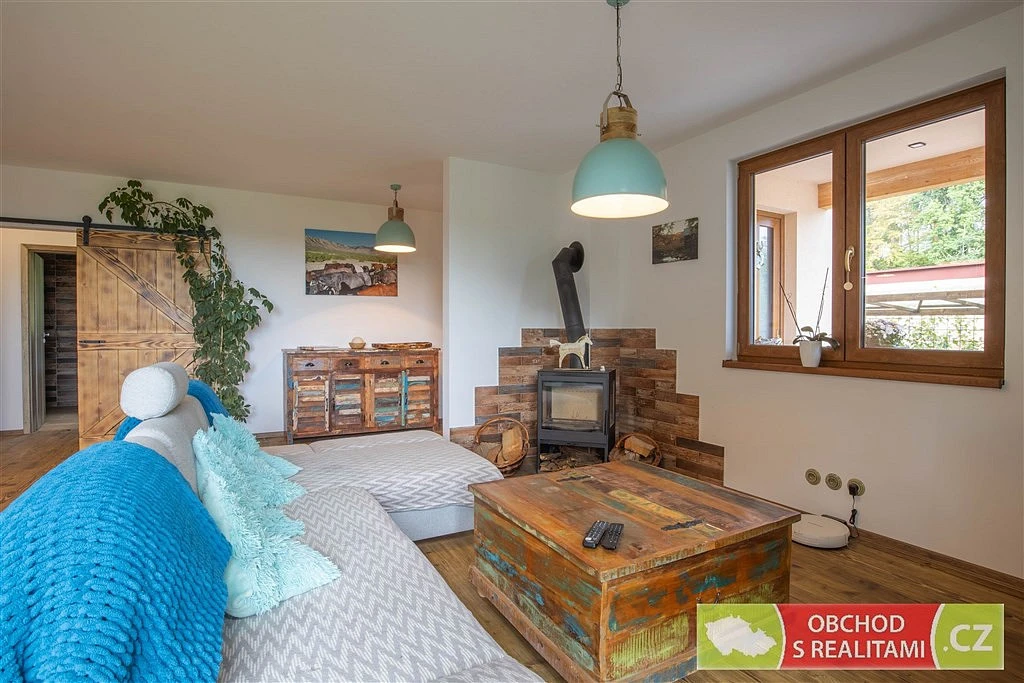 Výstavba rodinného domu byla dokončena v roce 2023. Dřevostavba vystavěná v energetické třídě A nabízí dispozici 3+KK s užitnou plochou 102 m². Dispoziční plán domu přikládáme do fotodokumentace této inzerce. Promyšlená dispozice obsahuje technickou místnost, spíž i šatnu, tedy dostatek úložných prostor mimo obytné místnosti; dále obsahuje obývací pokoj 46 m² s francouzským oknem a výhledem do krajiny; součástí jsou dvě koupelny, ta první se nachází u ložnic, ta druhá je přístupná ze zahrady (při pobytu venku máte k dispozici sprchový kout i WC). V celém domě je příjemné podlahové topení, v obývacím pokoji je možné topit též kamny.