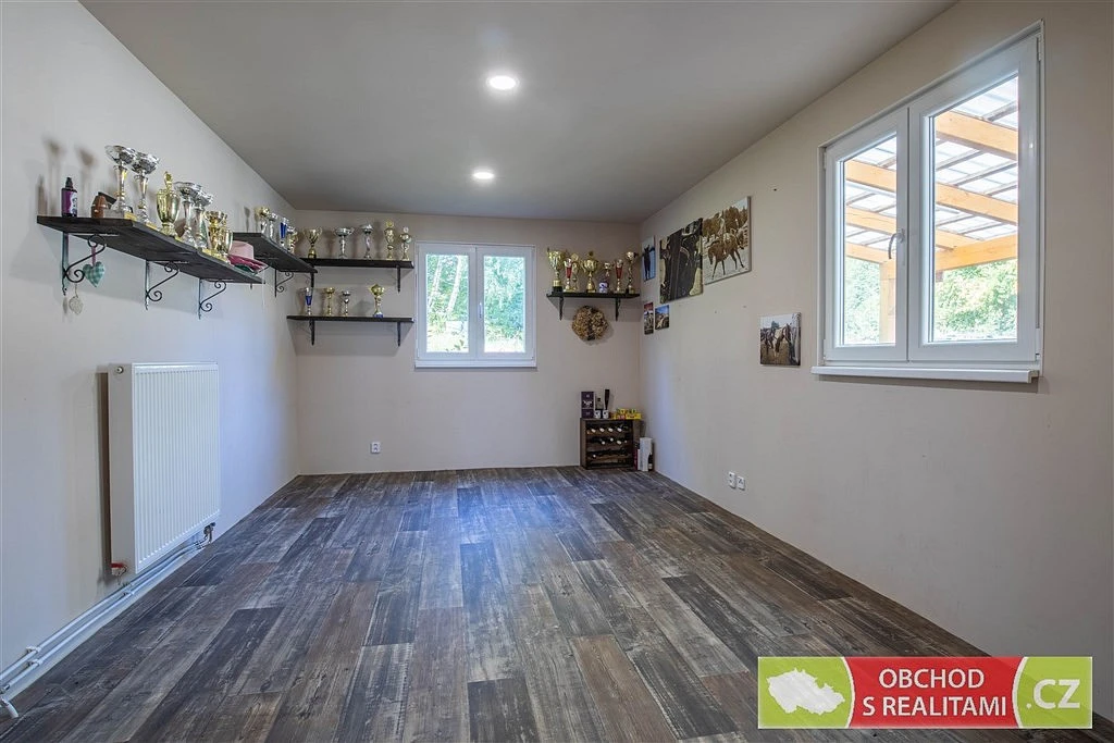 Dále se na pozemku nachází samostatná stavba hobby domku, která obsahuje dvě místnosti, každá s výměrou 20 m². Na hobby domek navazují krytá parkovací stání. I tato stavba je napojena na rozvod topení z tepelného čerpadla, a tak je možné místnosti temperovat, případně je k dispozici komínové těleso s kamny.