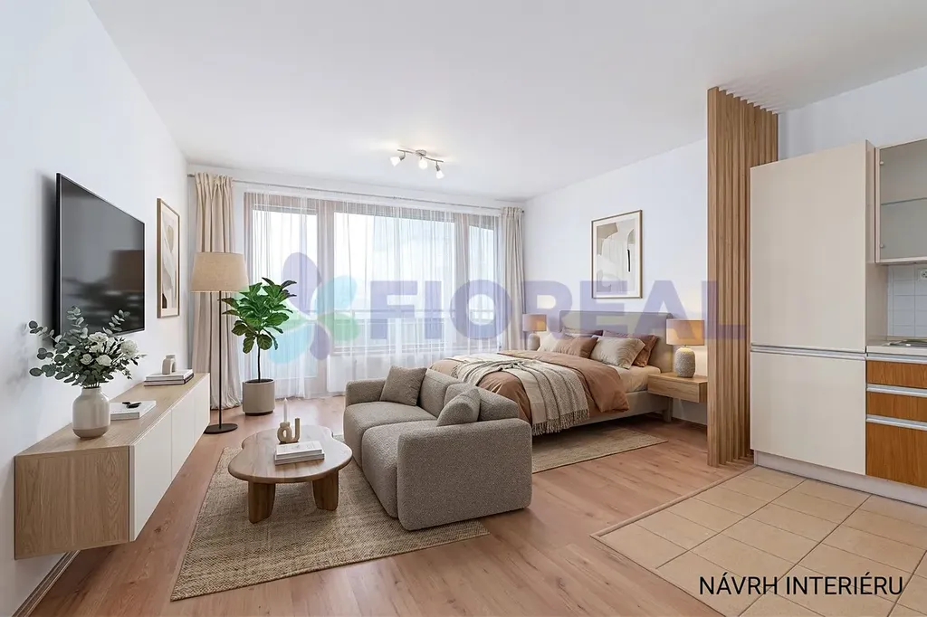 Interiér bytu se skládá z hlavní místnosti propojující obývací pokoj a kuchyňský kout, koupelny s WC a předsíně, kde jsou již hotové vestavné skříně pro uložení oblečení či věcí. Dispozice bytu umožňuje rozdělení pokoje do zón a umístit zde pohodlně dvojlůžko, sedací soupravu i jídelní stůl. K bytu náleží balkon o rozloze 6,3 m², kde si díky východní orientaci v klidu vychutnáte ranní kávu.