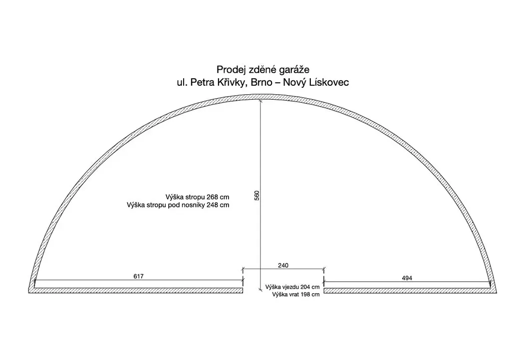 Šířka přední stěny s vjezdem: 13,50 m, hloubka garáže: 5,60 m, výška stropu: 2,70 m, vrata: šířka 2,4 m, výška 1,98 m.