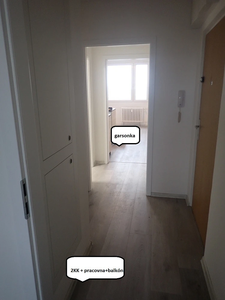 Jedná se o dva byty 2+KK a 1+KK, s jedním vchodem, dvěma kuchyňskými linkami a dvěma koupelnami. Umístění jednotky je v 8. patře panelového domu s výtahem, výměra 83 m². Byt prošel kompletní, nákladnou rekonstrukcí. Je čistý, vymalovaný a připravený k užívání od měsíce dubna. Součástí je 2x nová kuchyňská linka Ikea s vestavěnými, kvalitními spotřebiči, 2x postel v ložnici, pračka.