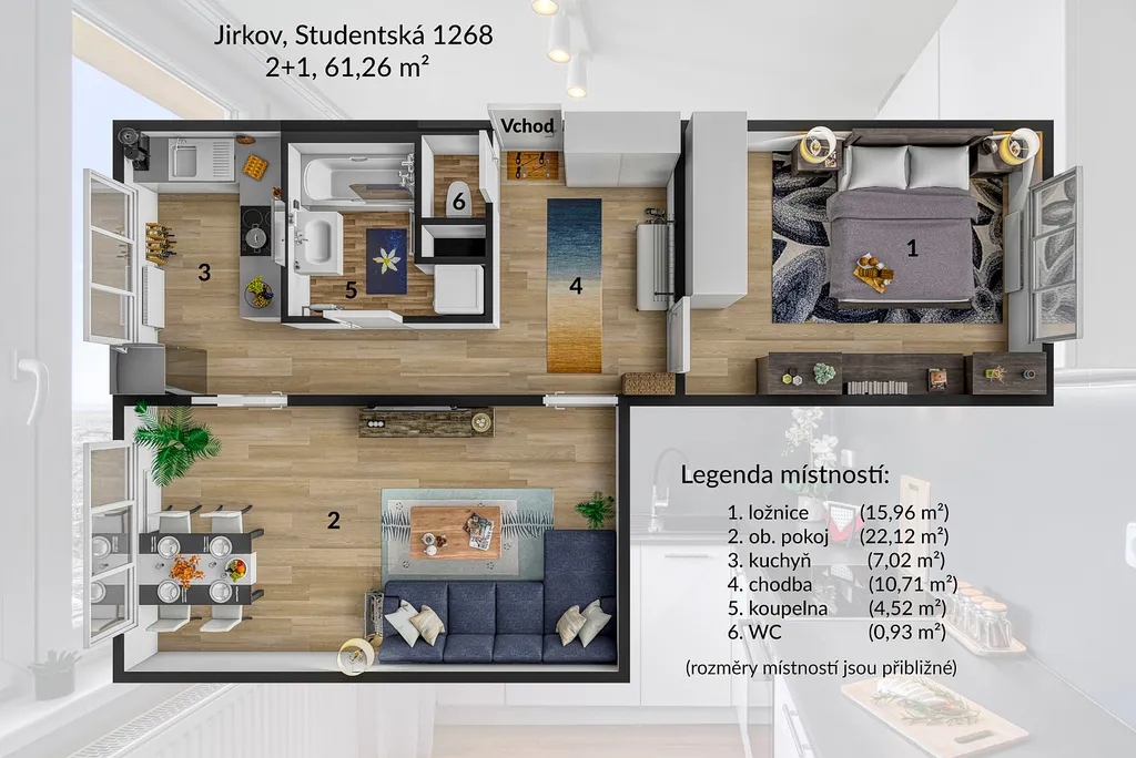 Nabízíme k dlouhodobému pronájmu světlý a prakticky řešený byt 2+1 o výměře 61 m² umístěný v 5.patře v klidné části Jirkova (ulice Studentská), který je ideální jak pro jednotlivce, tak pro pár hledající komfortní bydlení s výbornou dostupností do Chomutova i okolí.