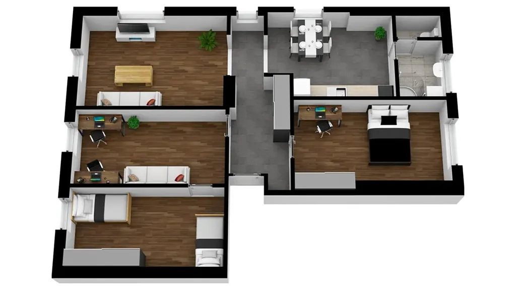 Byt je navržen s ohledem na moderní životní styl a nabízí prosvětlené prostory s pohodlným uspořádáním.