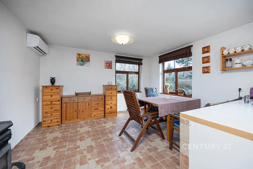 Dominantou interiéru je světlá vstupní místnost s kuchyňským koutem a jídelní částí, která vytváří příjemný prostor pro společné chvíle. Atmosféru dokreslují krbová kamna, zatímco komfort během horkých letních dnů zajišťuje klimatizace. Po schůdkách se vstupuje do útulné podkrovní ložnice.