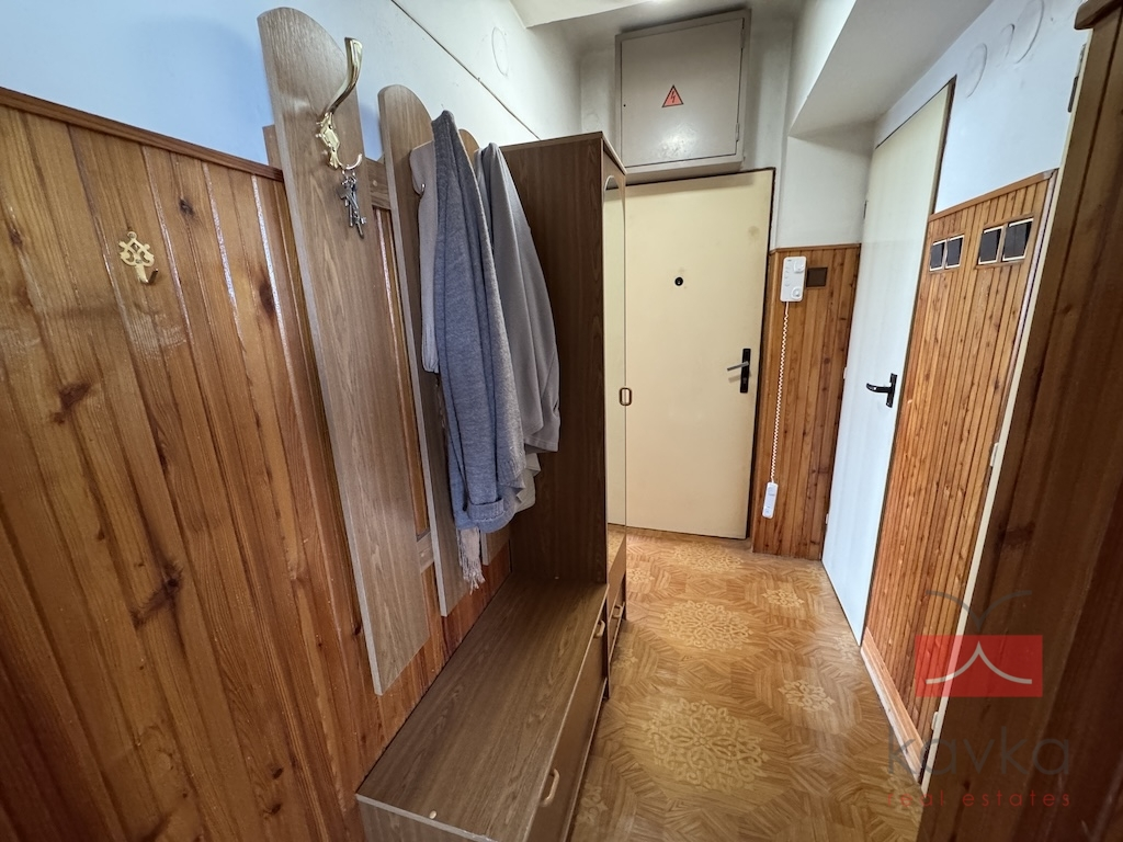 Dispozice bytu tvoří vstupní chodba, samostatné WC, koupelna s vanou, kuchyň, obývací pokoj se vstupem na zasklenou lodžii a samostatný pokoj.