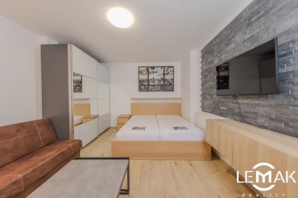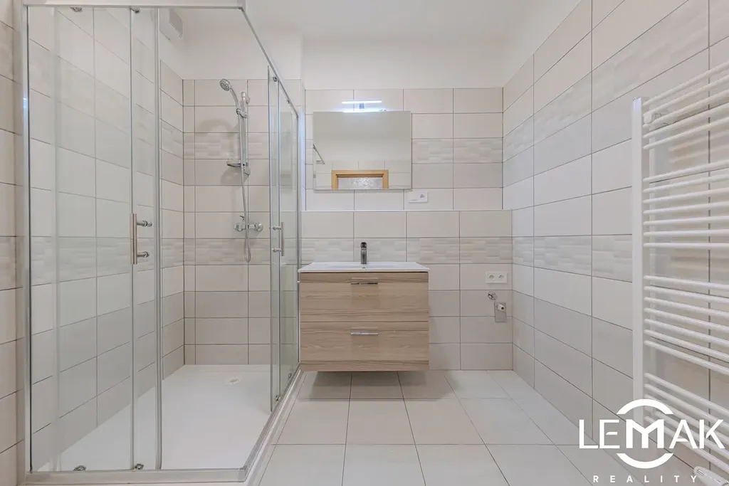 V koupelně se nachází sprchový kout, toaleta a otopný žebřík. Celý byt je navržen s důrazem na pohodlí a moderní design – v chodbě byla použita stylová šedá stěrka, v ložnici pak elegantní kamenný obklad. Terasa prošla nedávnou rekonstrukcí a byla osazena novou dlažbou.