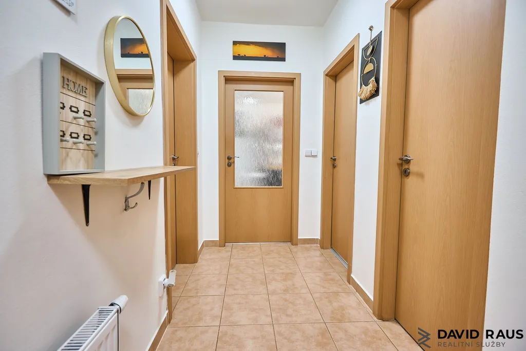 Byt je navržen s důrazem na praktické uspořádání prostoru a dostatek úložných možností. Po vstupu do bytu se ocitnete v prostorné předsíni, kde se po levé straně nachází velkorysá vestavěná skříň sahající až ke stropu, která nabízí dostatek místa pro uložení oblečení i dalších domácích potřeb. Po pravé straně předsíně je vstup do samostatného WC a koupelny. Přímo naproti koupelně se nachází samostatný pokoj, který je aktuálně využíván jako ložnice. Prostor je dostatečně velký nejen pro manželskou postel, ale také například pro dětskou postýlku či další úložný nábytek, což z něj činí velmi flexibilní místnost vhodnou pro různé životní situace. Z chodby dále vstoupíte do obývacího pokoje s kuchyňským koutem, který tvoří přirozené centrum celého bytu a nabízí dostatek prostoru pro každodenní život i odpočinek.