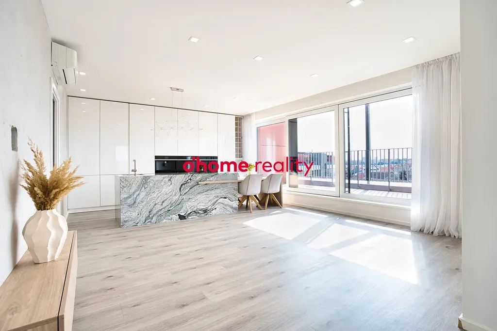 Kuchyňská část představuje skutečné designové i funkční centrum bytu. Dominantní ostrůvek z pravé žuly podtrhuje exkluzivní charakter prostoru. Veškeré spotřebiče jsou značky Whirlpool, včetně vestavěného kávovaru s technologií Jura. Nechybí dvě vestavěné lednice a nábytek na míru s precizně integrovaným osvětlením.