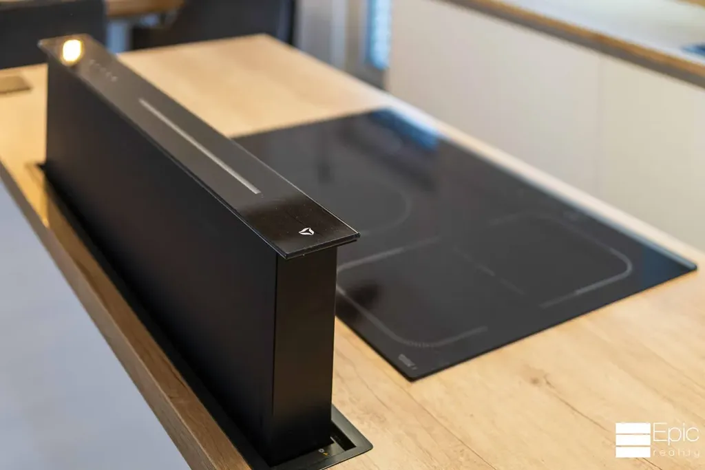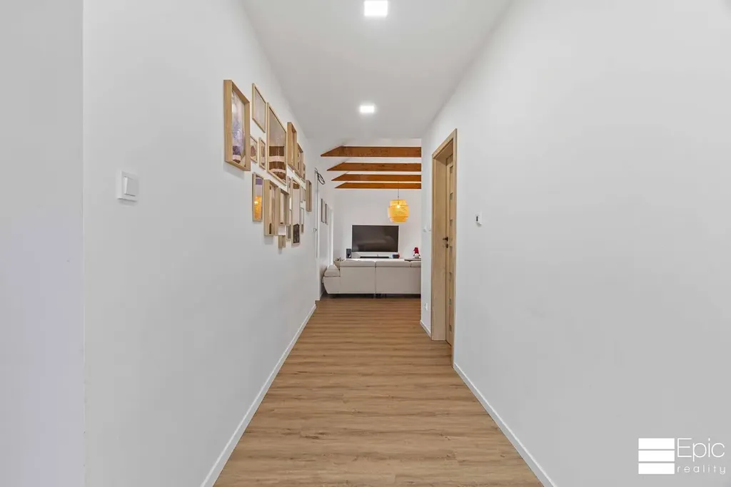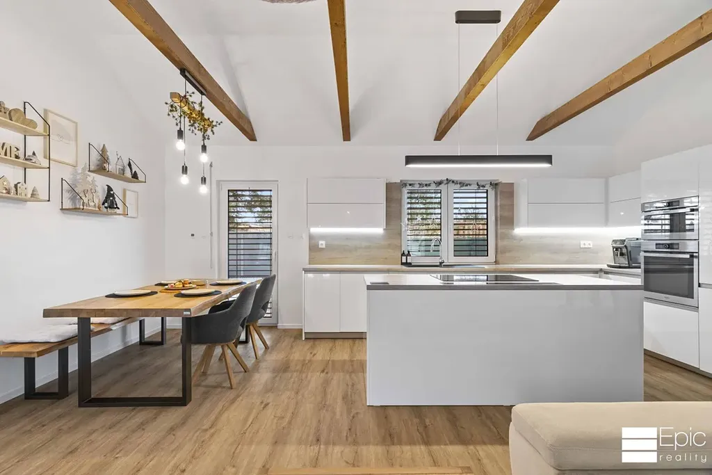 Srdcem domu je velkorysý otevřený prostor propojující kuchyň, jídelnu a obývací část vzdušný, světlý a ideální pro rodinný život i návštěvy. Kuchyně je na míru od truhláře a zaujme designovým řešením odsávání výsuvná digestoř elegantně zajíždí do pracovní plochy. Pro pocit útulna a domova krásně fungují i výrazné dřevěné prvky v obytné části, stejně tak vkusné světelné kulisy které si můžete volit dle nálady.