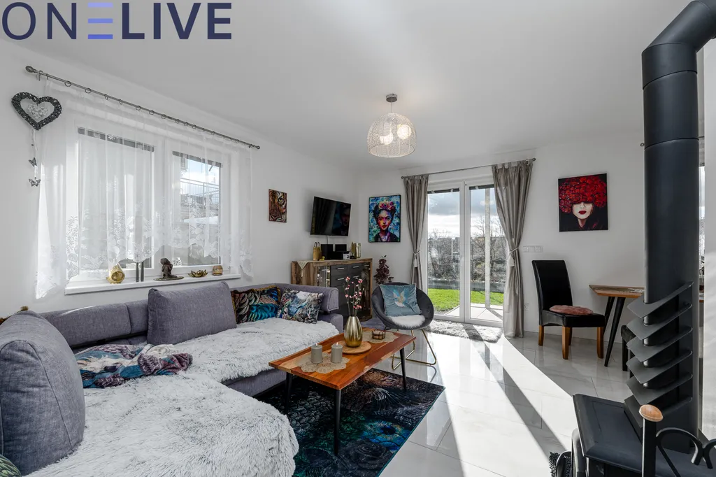 Byt je aktuálně částečně vybaven – zůstává moderní kuchyňská linka bez lednice, jídelní stůl, krbová kamna o výkonu 7 kW, vestavěná šatní skříň, zahradní nábytek na terasu a zahradní domek. Na fotografiích je byt vybaven kompletně, nicméně aktuální stav odpovídá výše uvedenému.