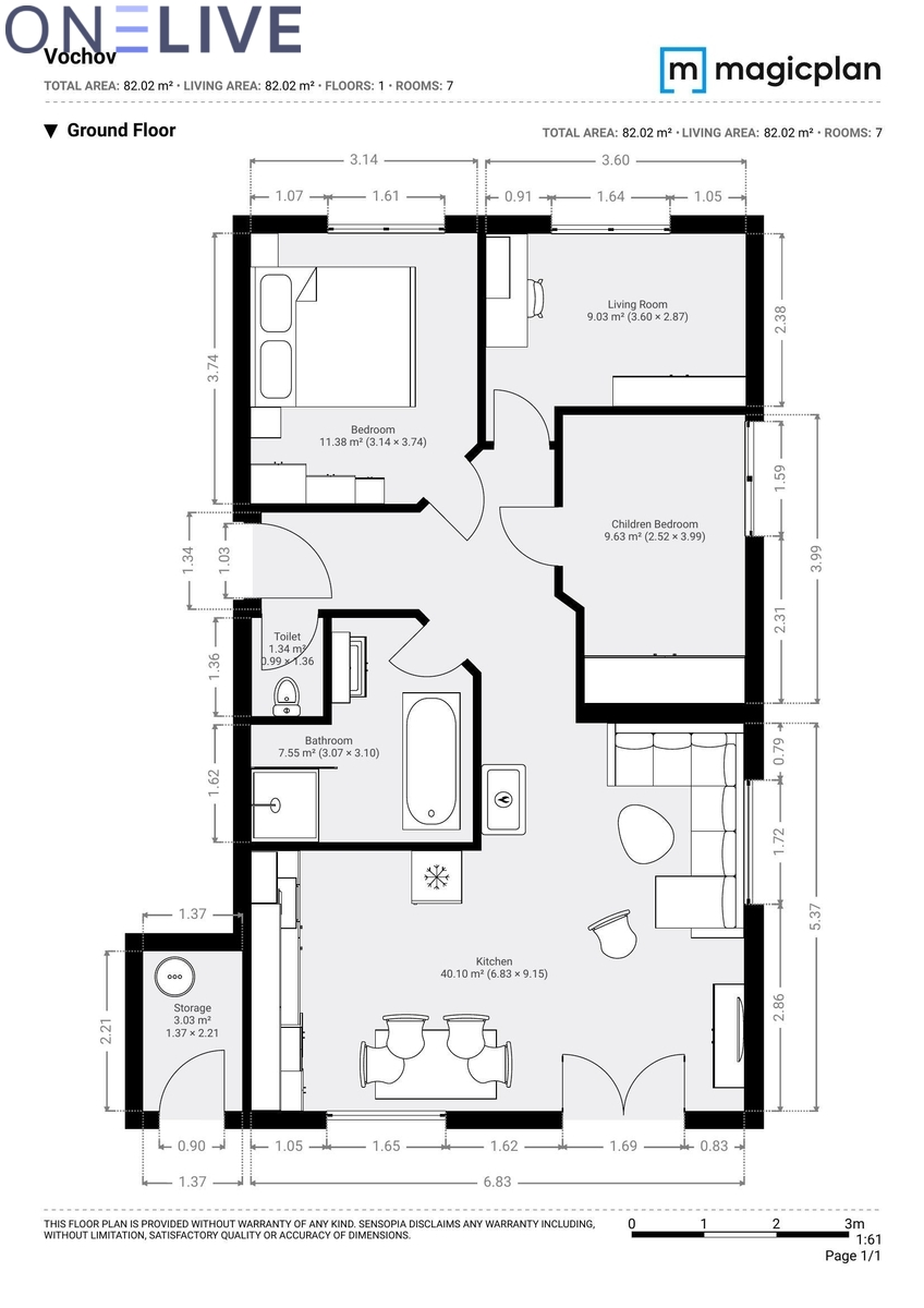 Dispozičně je byt velmi dobře řešený – obývací pokoj s kuchyňským koutem a vstupem na terasu a zahradu, tři samostatné pokoje, koupelna, toaleta a vstupní chodba.