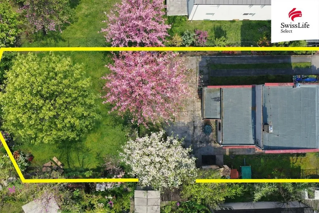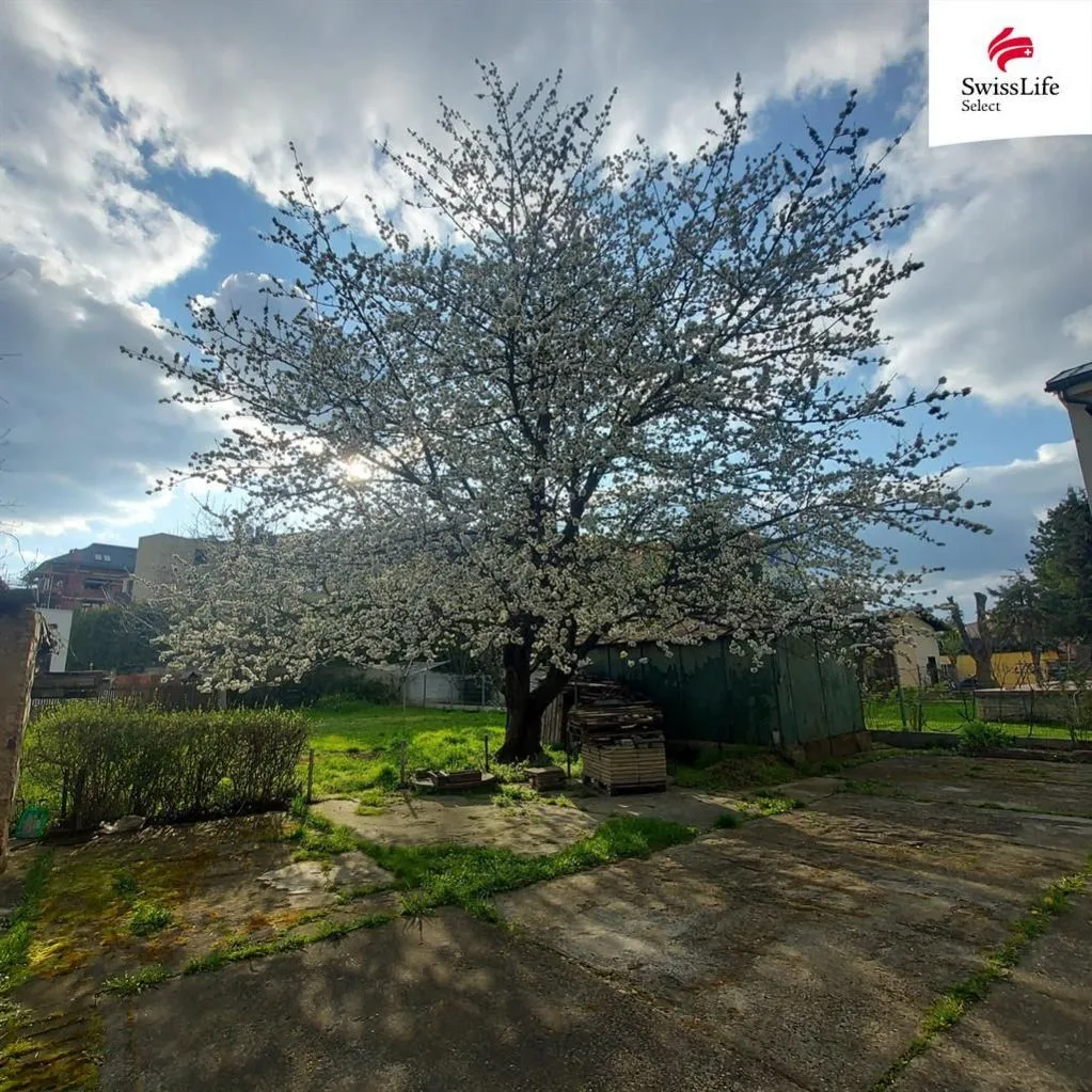 Poznámka k fotografiím: Rozkvetlá třešeň je focená v minulém roce. Navazující fotografie ze zahrady a dvorku jsou aktuální. Poslední dvě fotografie jsou vizualizace. Žluté vyznačení hranic u pozemku je zakresleno podle skutečné výměry.