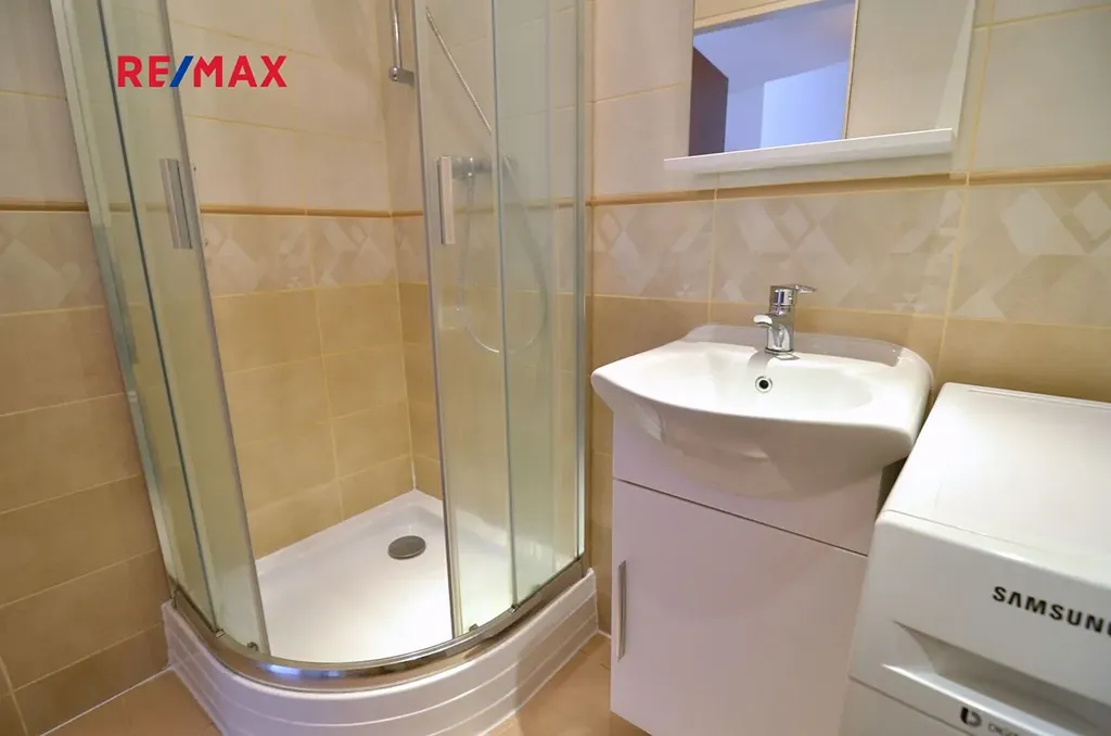 Koupelna (3,2 m2) je vybavená sprchovým koutem, umyvadlem a WC. K dispozici je pračka se sušičkou.