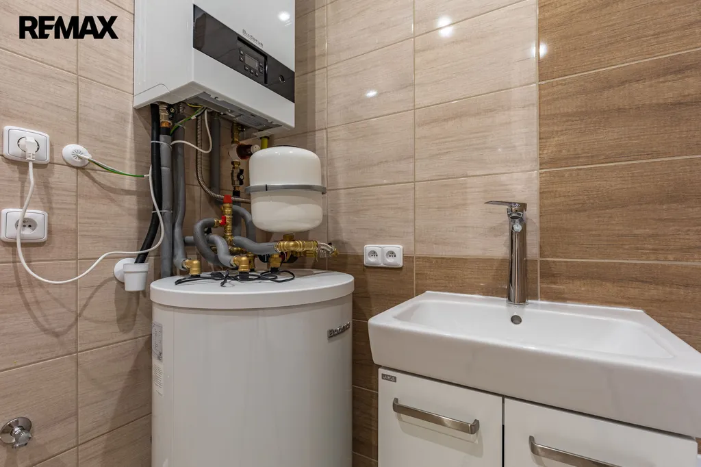 Vytápění i ohřev vody je řešen úsporným kondenzačním plynovým kotlem BUDERUS se zásobníkem 115 l umístěném v koupelně. Rozvody do radiátorů ve všech místnostech i na chodbě.