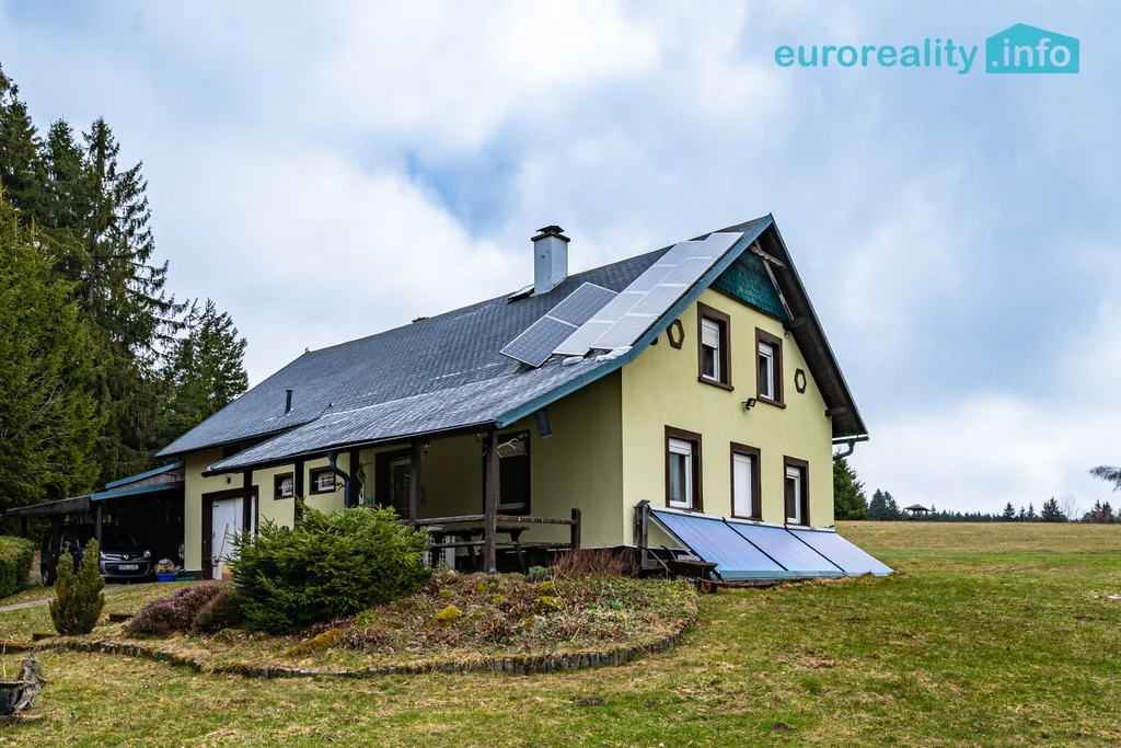 Nabízíme k prodeji rodinný dům situovaný na polosamotě v obci Háje u Lesné v okrese Tachov, jen několik minut od hranic s Německem. Nemovitost se nachází v krásné přírodě Českého lesa a nabízí absolutní klid, soukromí a velkorysý prostor. Dům o užitné ploše přibližně 178 m² stojí na rozlehlém pozemku o celkové výměře 25 612 m², který poskytuje široké možnosti využití – od komfortního rodinného bydlení až po hospodaření, chov zvířat nebo rekreační využití. Dům je dvoupodlažní a nabízí praktickou dispozici s obytnou částí v přízemí a podkrovím, kde se nachází další pokoje a otevřený prostor vhodný například jako pracovna, ateliér nebo herna. Součástí domu je také garáž a kryté parkovací stání. Velkou výhodou nemovitosti je její technické a energetické zázemí. Na střeše domu jsou instalovány fotovoltaické panely a solární kolektory pro ohřev vody. Energetickou soběstačnost dále podporuje větrná turbína umístěná na pozemku. V suterénu domu se nachází technická místnost s akumulačními nádržemi a technologií pro efektivní vytápění a hospodaření s energií. Zásobování vodou je řešeno pomocí vrtané i kopané studny. Pozemek o velikosti více než 2,5 hektaru poskytuje dostatek prostoru pro soukromí i různé formy využití. Okolí domu tvoří louky a lesy, což zajišťuje příjemné a klidné prostředí ideální pro milovníky přírody, turistiky nebo venkovského života. Tato nemovitost představuje ideální příležitost pro ty, kteří hledají bydlení v přírodě s velkým pozemkem, dostatkem prostoru a možností částečné energetické nezávislosti. Zároveň nabízí velmi dobré spojení do Německa i do okolních měst. V případě zájmu o více informací nebo domluvení prohlídky nás neváhejte kontaktovat.