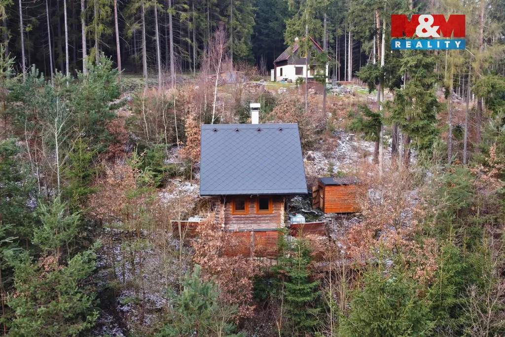 Srub stojí na pozemku jiného vlastníka. Smluvený nájem činí 5000,- za rok. Voda je užitková z nádrže za srubem. WC suché, nebo chemické.