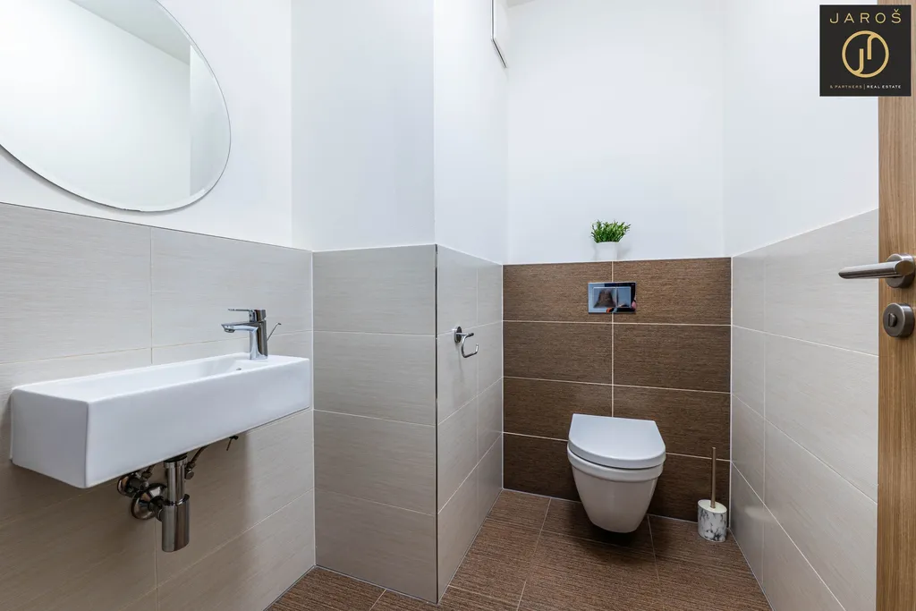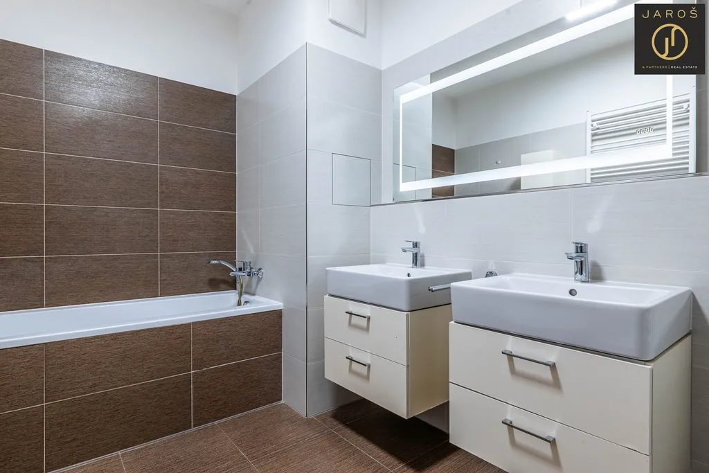 Koupelna je prostorná, vybavená vanou i pračkou a nabízí dostatek místa pro pohodlné užívání. Toaleta je samostatná a disponuje vlastním umyvadlem. Kuchyňská linka je plně vybavena spotřebiči – lednicí s mrazákem, sklokeramickou varnou deskou, troubou, mikrovlnnou troubou, digestoří a myčkou.