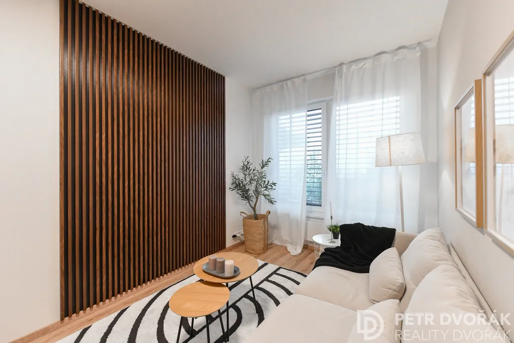 Dispozici 2+kk tvoří prosvětlený obývací pokoj s plně vybaveným kuchyňským koutem a navazující ložnice. Velkoformátová okna s izolačními trojskly a elektricky ovládanými exteriérovými žaluziemi zajišťují v interiéru příjemné klima po celý rok. Byt je vybaven systémem řízeného větrání s rekuperací tepla a inteligentním systémem Somfy TaHoma.