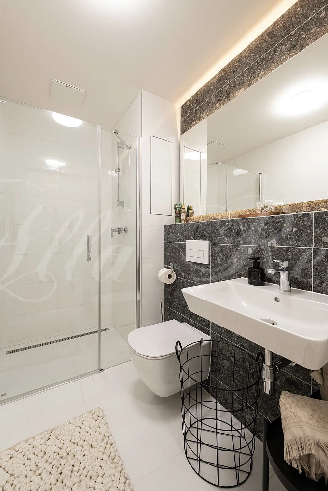 V koupelně bude stylová dlažba s velkým zrcadlem, WC a sprchový kout.