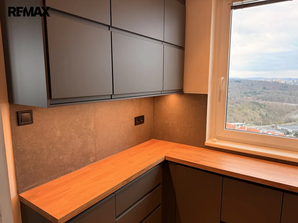 Exklusivně nabízíme k prodeji jedinečný byt 3+1 L s komorou a šatnou. po kompletní rekonstrukci v 19. patře s neopakovatelným výhledem. Byt splňuje nároky na moderní a komfortní bydlení ve vysokém standardu. Nová kuchyňská linka vyrobená na míru je vybavená novými kvalitními vestavěnými spotřebiči, lednicí s mrazákem, indukční varnou deskou, horkovzdušnou troubou, myčkou na nádobí, mikrovlnnou troubou. Byt má zasklené dvě lodžie o celkové ploše 13 m². Tichý a dechberoucím výhledem výšky 19. patra na les a každodenní shon města, je srovnatelný s pohledem ze stejné výšky nedalekého V-Toweru. Vstup do domu je bezbariérový situovaný v prestižním rezidenčním projektu, zabezpečený kamerovým systémem se záznamem, k dispozici jsou dva výtahy - osobní i nákladní.