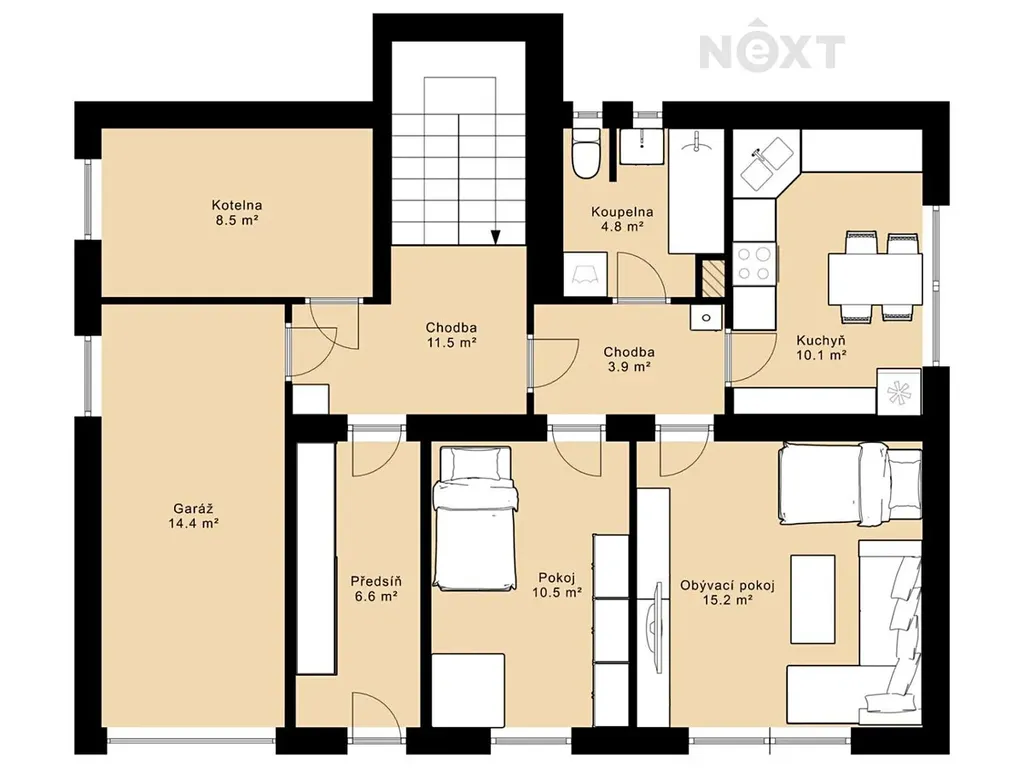 1. patro: světlý a vzdušný byt 3+1 s terasou orientovanou na jih. Užitná plocha prvního patra je 84 m2.