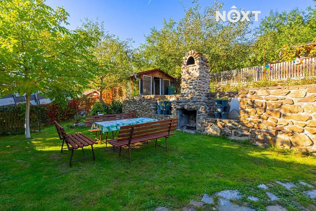 K domu náleží oplocená, kaskádovitě řešená zahrada s travnatou plochou, ovocnými stromy a místem pro posezení. Součástí domu je také krytá terasa s krbem, ideální pro odpočinek i grilování. Na pozemku se nachází zahradní domek, který lze využít jako dílničku, ateliér nebo ubytování pro hosty.