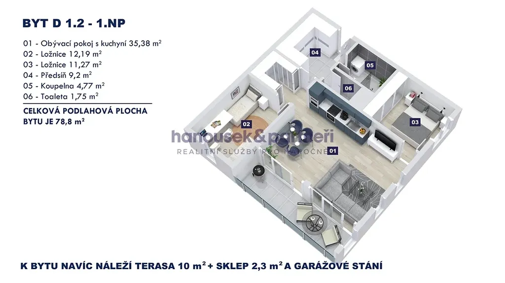 Nabízím vám byt s dispozicí 3+kk o velikosti 78,8 m2. V bytě je obývací pokoj s kuchyní, 2 ložnice, předsíň, koupelna se sprchovým koutem a samostatné WC. Nachází se v 1. patře domu D a navíc k němu patří terasa s výměrou 10 m2, sklep a garážové stání.